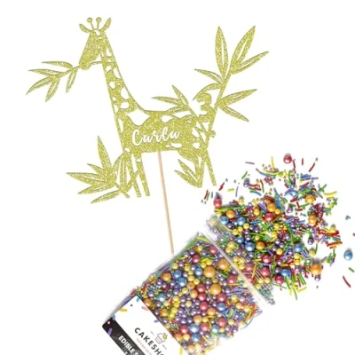 Cakeshop Cake Decoration Pack Jungle Giraffe Birthday Premium Double Sided Glitter Card Topper & 25g Party of Sugar Sprinkles Custom Name Age (Champagne)