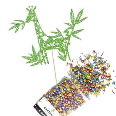 Cakeshop Cake Decoration Pack Jungle Giraffe Birthday Premium Double Sided Glitter Card Topper & 25g Party of Sugar Sprinkles Custom Name Age (Green)