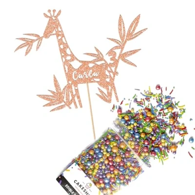 Cakeshop Cake Decoration Pack Jungle Giraffe Birthday Premium Double Sided Glitter Card Topper & 25g Party of Sugar Sprinkles Custom Name Age (Rose Gold)