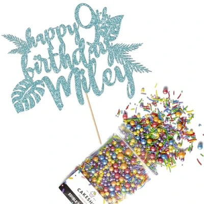Cakeshop Cake Decoration Pack Jungle Happy Birthday Premium Double Sided Glitter Card Topper & 25g Party of Sugar Sprinkles Custom Name Age (Baby Blue)