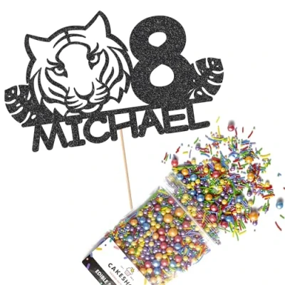 Cakeshop Cake Decoration Pack Jungle Happy Birthday Premium Double Sided Glitter Card Topper & 25g Party of Sugar Sprinkles Custom Name Age (Black)