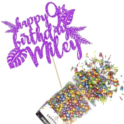 Cakeshop Cake Decoration Pack Jungle Happy Birthday Premium Double Sided Glitter Card Topper & 25g Party of Sugar Sprinkles Custom Name Age (Purple)