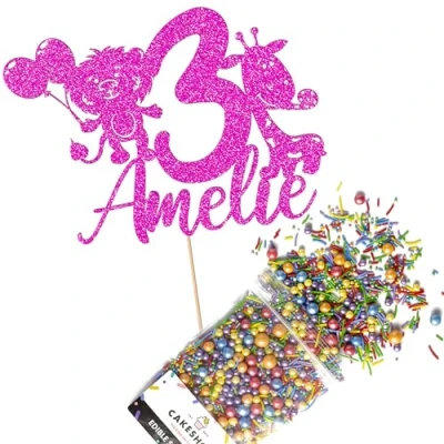 Cakeshop Cake Decoration Pack Jungle Party Birthday Premium Double Sided Glitter Card Topper & 25g of Sugar Sprinkles Custom Name Age (Bright Pink)