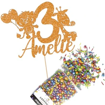 Cakeshop Cake Decoration Pack Jungle Party Birthday Premium Double Sided Glitter Card Topper & 25g of Sugar Sprinkles Custom Name Age (Orange)
