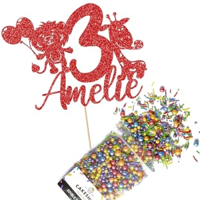 Cakeshop Cake Decoration Pack Jungle Party Birthday Premium Double Sided Glitter Card Topper & 25g of Sugar Sprinkles Custom Name Age (Red)