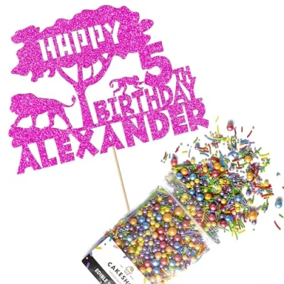 Cakeshop Cake Decoration Pack Jungle Safari Birthday Premium Double Sided Glitter Card Topper & 25g Party of Sugar Sprinkles Custom Name Age (Bright Pink)