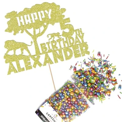 Cakeshop Cake Decoration Pack Jungle Safari Birthday Premium Double Sided Glitter Card Topper & 25g Party of Sugar Sprinkles Custom Name Age (Champagne)