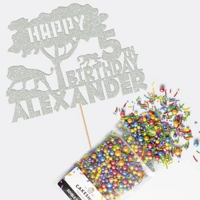 Cakeshop Cake Decoration Pack Jungle Safari Birthday Premium Double Sided Glitter Card Topper & 25g Party of Sugar Sprinkles Custom Name Age (Light Silver)
