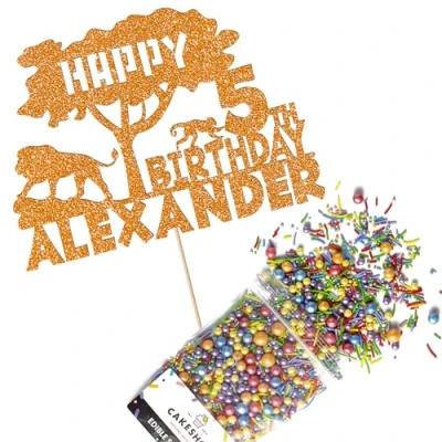 Cakeshop Cake Decoration Pack Jungle Safari Birthday Premium Double Sided Glitter Card Topper & 25g Party of Sugar Sprinkles Custom Name Age (Orange)