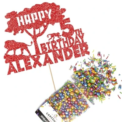 Cakeshop Cake Decoration Pack Jungle Safari Birthday Premium Double Sided Glitter Card Topper & 25g Party of Sugar Sprinkles Custom Name Age (Red)