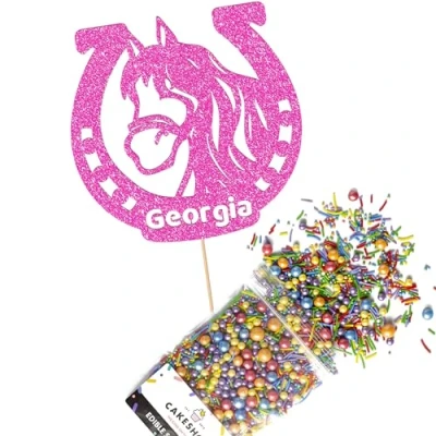 Cakeshop Cake Decoration Pack Lucky Horseshoe Premium Double Sided Glitter Card Topper Sign & 25g Party of Sugar Sprinkles Custom Name Decorations (Baby Pink)