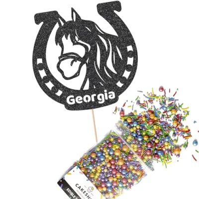Cakeshop Cake Decoration Pack Lucky Horseshoe Premium Double Sided Glitter Card Topper Sign & 25g Party of Sugar Sprinkles Custom Name Decorations (Black)
