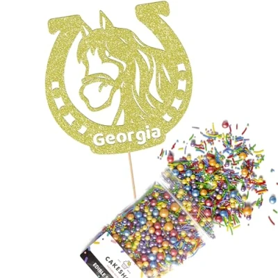 Cakeshop Cake Decoration Pack Lucky Horseshoe Premium Double Sided Glitter Card Topper Sign & 25g Party of Sugar Sprinkles Custom Name Decorations (Champagne)