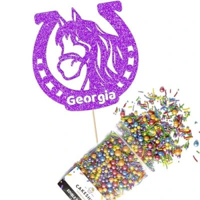 Cakeshop Cake Decoration Pack Lucky Horseshoe Premium Double Sided Glitter Card Topper Sign & 25g Party of Sugar Sprinkles Custom Name Decorations (Purple)
