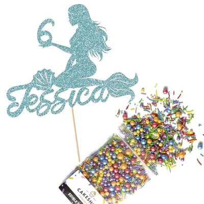Cakeshop Cake Decoration Pack Mermaid Happy Birthday Premium Double Sided Glitter Card Topper & 25g Party of Sugar Sprinkles Custom Name Age Decorations (Baby Blue)