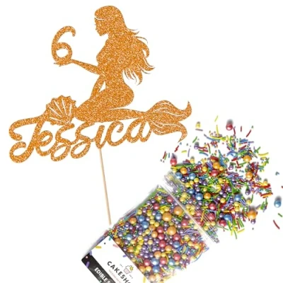 Cakeshop Cake Decoration Pack Mermaid Happy Birthday Premium Double Sided Glitter Card Topper & 25g Party of Sugar Sprinkles Custom Name Age Decorations (Orange)