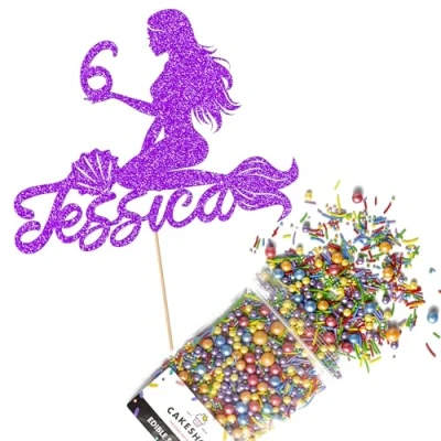 Cakeshop Cake Decoration Pack Mermaid Happy Birthday Premium Double Sided Glitter Card Topper & 25g Party of Sugar Sprinkles Custom Name Age Decorations (Purple)