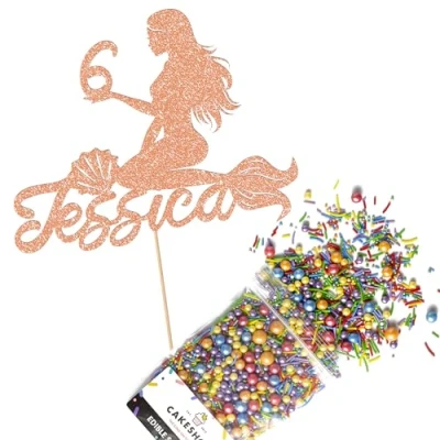 Cakeshop Cake Decoration Pack Mermaid Happy Birthday Premium Double Sided Glitter Card Topper & 25g Party of Sugar Sprinkles Custom Name Age Decorations (Rose Gold)