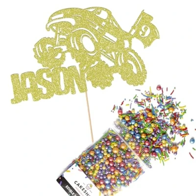 Cakeshop Cake Decoration Pack Monster Truck Birthday Premium Double Sided Glitter Card Topper & 25g Party of Sugar Sprinkles Custom Name Age Decorations (Champagne)