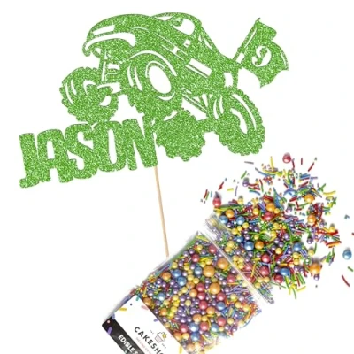 Cakeshop Cake Decoration Pack Monster Truck Birthday Premium Double Sided Glitter Card Topper & 25g Party of Sugar Sprinkles Custom Name Age Decorations (Green)