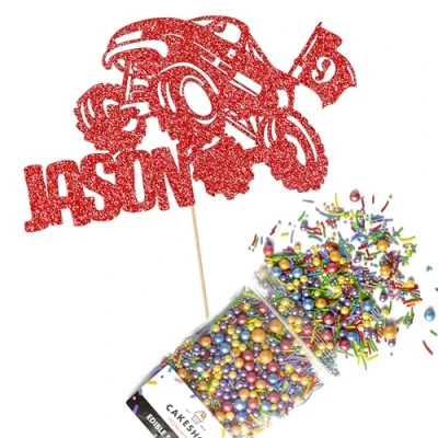 Cakeshop Cake Decoration Pack Monster Truck Birthday Premium Double Sided Glitter Card Topper & 25g Party of Sugar Sprinkles Custom Name Age Decorations (Red)