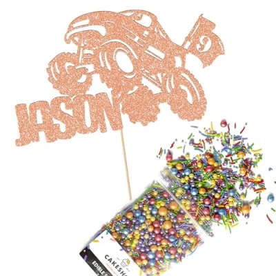 Cakeshop Cake Decoration Pack Monster Truck Birthday Premium Double Sided Glitter Card Topper & 25g Party of Sugar Sprinkles Custom Name Age Decorations (Rose Gold)
