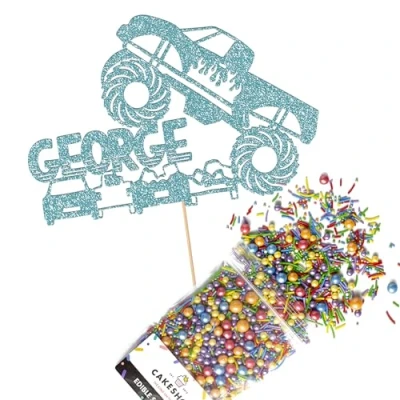 Cakeshop Cake Decoration Pack Monster Truck Birthday Premium Double Sided Glitter Card Topper Sign & 25g Party of Sugar Sprinkles Custom Name Decorations (Baby Blue)