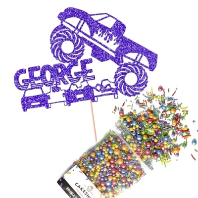 Cakeshop Cake Decoration Pack Monster Truck Birthday Premium Double Sided Glitter Card Topper Sign & 25g Party of Sugar Sprinkles Custom Name Decorations (Bright Blue)