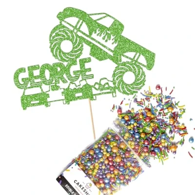 Cakeshop Cake Decoration Pack Monster Truck Birthday Premium Double Sided Glitter Card Topper Sign & 25g Party of Sugar Sprinkles Custom Name Decorations (Green)