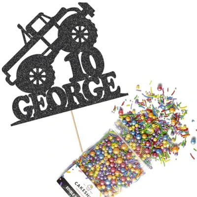 Cakeshop Cake Decoration Pack Monster Truck Theme Premium Double Sided Glitter Card Topper & 25g Party of Sugar Sprinkles Custom Name Age Decorations (Black)