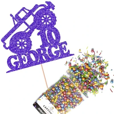 Cakeshop Cake Decoration Pack Monster Truck Theme Premium Double Sided Glitter Card Topper & 25g Party of Sugar Sprinkles Custom Name Age Decorations (Bright Blue)