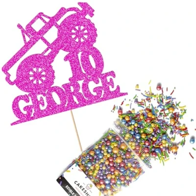 Cakeshop Cake Decoration Pack Monster Truck Theme Premium Double Sided Glitter Card Topper & 25g Party of Sugar Sprinkles Custom Name Age Decorations (Bright Pink)