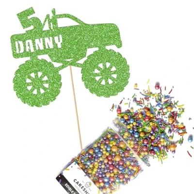 Cakeshop Cake Decoration Pack Monster Truck Theme Premium Double Sided Glitter Card Topper & 25g Party of Sugar Sprinkles Custom Name Age Decorations (Green)