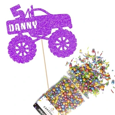 Cakeshop Cake Decoration Pack Monster Truck Theme Premium Double Sided Glitter Card Topper & 25g Party of Sugar Sprinkles Custom Name Age Decorations (Purple)