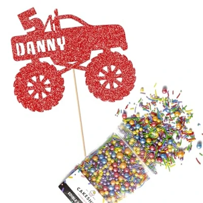 Cakeshop Cake Decoration Pack Monster Truck Theme Premium Double Sided Glitter Card Topper & 25g Party of Sugar Sprinkles Custom Name Age Decorations (Red)