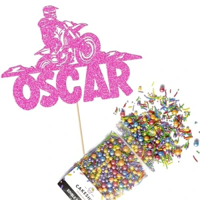 Cakeshop Cake Decoration Pack Motorcross Dirtbike Theme Premium Double Sided Glitter Card Topper & 25g Party of Sugar Sprinkles Custom Name Decorations (Baby Pink)