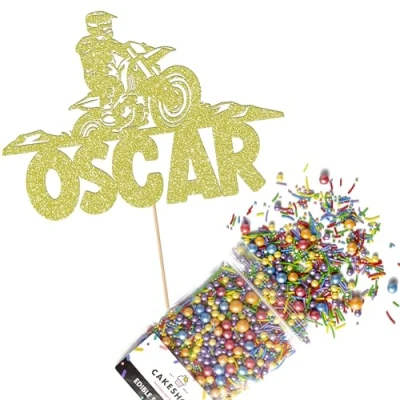 Cakeshop Cake Decoration Pack Motorcross Dirtbike Theme Premium Double Sided Glitter Card Topper & 25g Party of Sugar Sprinkles Custom Name Decorations (Champagne)