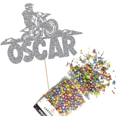 Cakeshop Cake Decoration Pack Motorcross Dirtbike Theme Premium Double Sided Glitter Card Topper & 25g Party of Sugar Sprinkles Custom Name Decorations (Dark Silver)