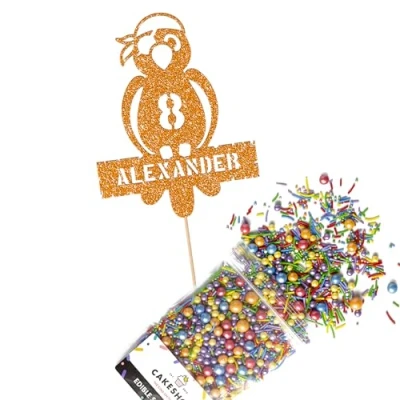 Cakeshop Cake Decoration Pack Parrot Pirate Premium Double Sided Glitter Card Topper Sign & 25g Party of Sugar Sprinkles Custom Name Age Decorations (Orange)