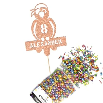 Cakeshop Cake Decoration Pack Parrot Pirate Premium Double Sided Glitter Card Topper Sign & 25g Party of Sugar Sprinkles Custom Name Age Decorations (Rose Gold)