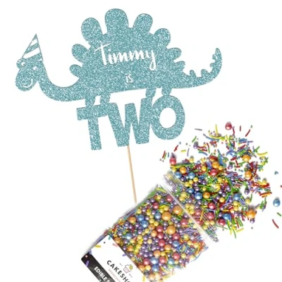 Cakeshop Cake Decoration Pack Party Dinosaur Premium Double Sided Glitter Card Topper Sign & 25g of Sugar Sprinkles Custom Name Age Decorations (Baby Blue)