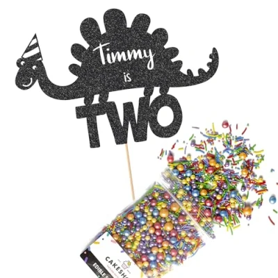 Cakeshop Cake Decoration Pack Party Dinosaur Premium Double Sided Glitter Card Topper Sign & 25g of Sugar Sprinkles Custom Name Age Decorations (Black)