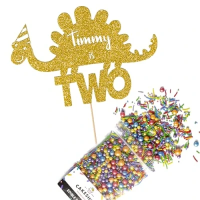 Cakeshop Cake Decoration Pack Party Dinosaur Premium Double Sided Glitter Card Topper Sign & 25g of Sugar Sprinkles Custom Name Age Decorations (Gold)