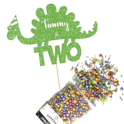 Cakeshop Cake Decoration Pack Party Dinosaur Premium Double Sided Glitter Card Topper Sign & 25g of Sugar Sprinkles Custom Name Age Decorations (Green)