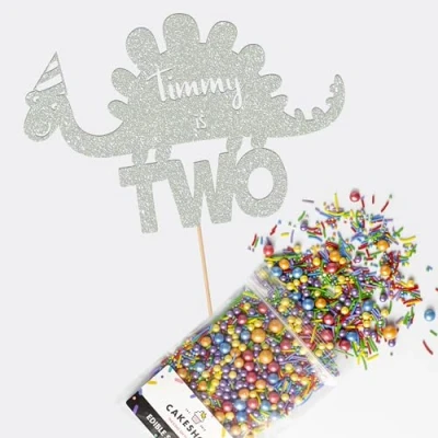 Cakeshop Cake Decoration Pack Party Dinosaur Premium Double Sided Glitter Card Topper Sign & 25g of Sugar Sprinkles Custom Name Age Decorations (Light Silver)