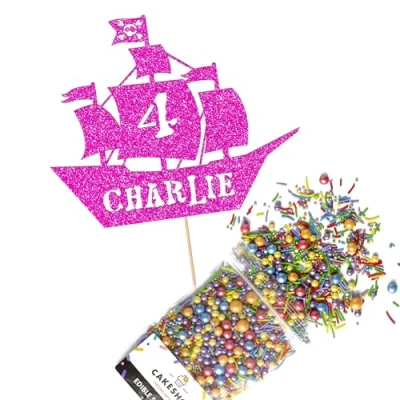 Cakeshop Cake Decoration Pack Pirate Ship Birthday Premium Double Sided Glitter Card Topper & 25g Party of Sugar Sprinkles Custom Name Age Decorations (Bright Pink)