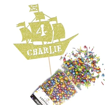 Cakeshop Cake Decoration Pack Pirate Ship Birthday Premium Double Sided Glitter Card Topper & 25g Party of Sugar Sprinkles Custom Name Age Decorations (Champagne)