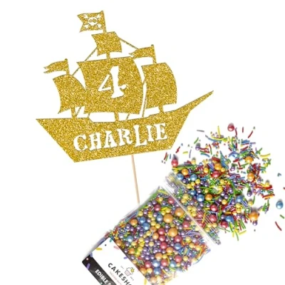 Cakeshop Cake Decoration Pack Pirate Ship Birthday Premium Double Sided Glitter Card Topper & 25g Party of Sugar Sprinkles Custom Name Age Decorations (Gold)