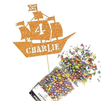 Cakeshop Cake Decoration Pack Pirate Ship Birthday Premium Double Sided Glitter Card Topper & 25g Party of Sugar Sprinkles Custom Name Age Decorations (Orange)