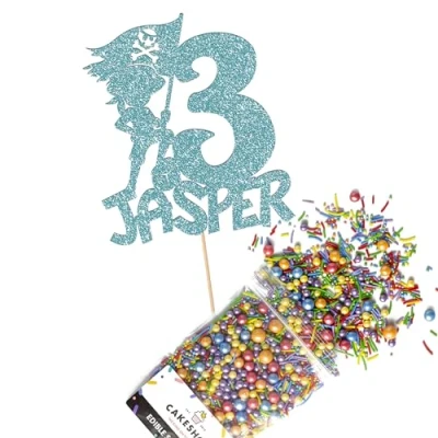 Cakeshop Cake Decoration Pack Pirate Theme Premium Double Sided Glitter Card Topper Sign & 25g Party of Sugar Sprinkles Custom Name Age Decorations (Baby Blue)